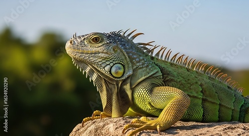 Obraz premium Green iguana basking in the sun, a common reptile in tropical climates