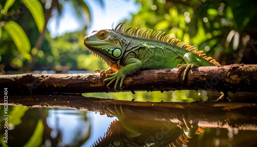 © Zevania, Fototapeta premium Green iguana hides among verdant leaves