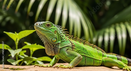 © Usman, Obraz premium Green Iguana on Sunlit Rock