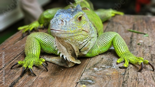 © Gianti, Fototapeta premium Green iguana or the American iguana on the wooden floor.