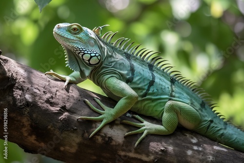 Obraz premium Green iguana perched on a tree branc