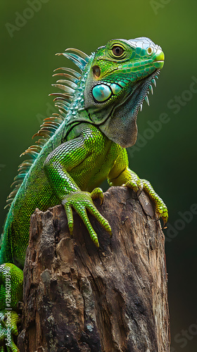© Noah, Obraz premium Green iguana perched on a tree stump, with a vibrant green and blue coloration