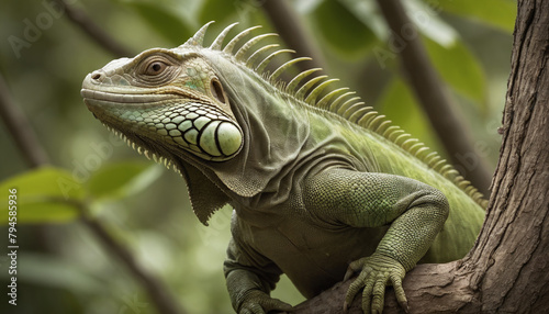 © Santiago, Obraz premium Green Iguana Perched on Tree Branch