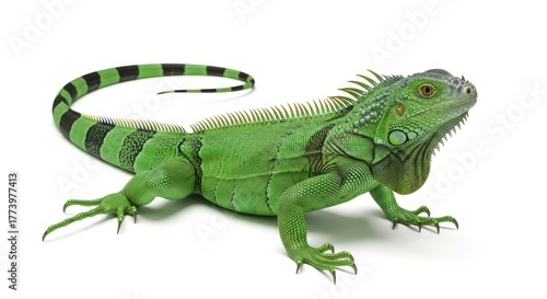© Tida, Obraz premium Green Iguana Reptile Crawling On White Background - Captivating iguana portrait showcases resilience, adaptability, vibrant life, exotic nature, and the beauty of wildlife