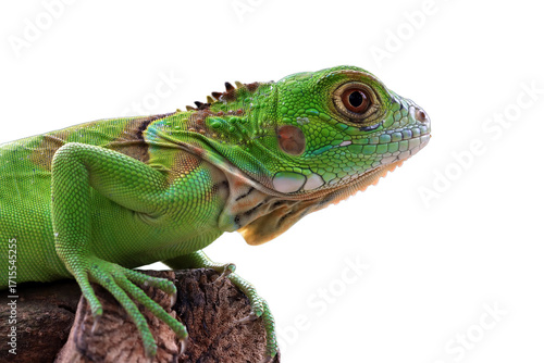 Obraz premium Green iguana side view on wood, Green iguana closeup on isolated background
