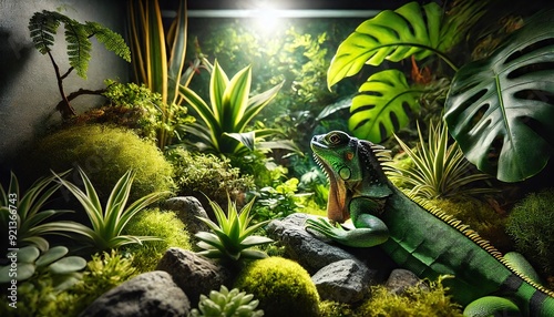 Obraz premium Green Iguana sunbathing on a rock in a terrarium (4)