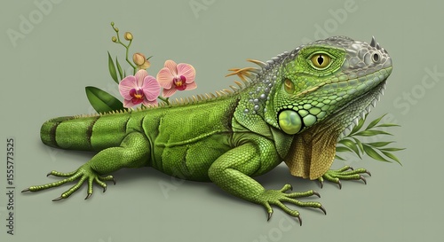 © OmRioRio, Fototapeta premium Green Iguana with Pink Orchids