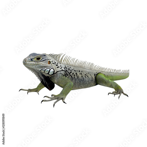 © CHA, Obraz premium Green Iguana with Unique Features on White Background