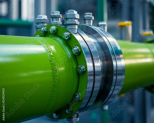 © DeepView, Obraz premium Green Industrial Pipe with Double Flange Connection