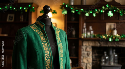 © Eduardo Accorinti, Obraz premium Green jacket on mannequin with celtic embroidery, celebrating st. Patrick's day in a traditional setting