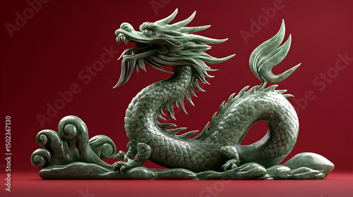Fototapeta premium Green jade dragon statue against a deep red backdrop evoking mythology and...