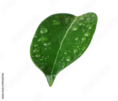 © New Africa, Fototapeta premium Green jasmine leaf with water drops isolated on white