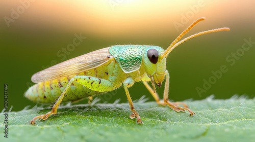 © tugkiara, Fototapeta premium Green katydid on leaf at sunset, nature macro. Use nature websites