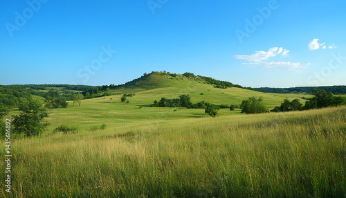 © Oleksiy, Fototapeta premium Green Land, Blue Sky, Summer Sunny Day Background, Wide View Of Lawn Hill and Blue Sky