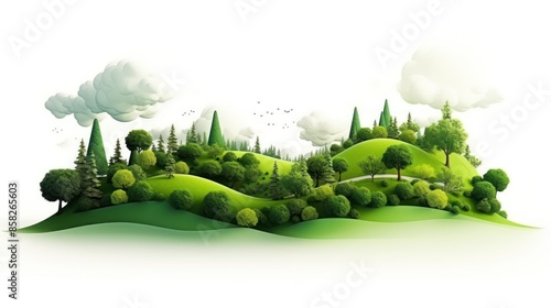 Naklejka premium green landscape isolated on white background, nature, mountain, trees, sky, forest, background, hill, watercolor, scenery, morning, summer, travel, recreation, relax