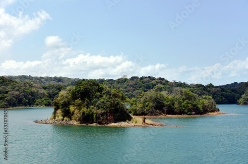 © Mariusz, Obraz premium Green landscape of Panama Canal, view from the transiting cargo ship.