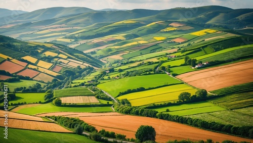Fototapeta premium Green Landscape View with Fields and Hills. Aerial scenery includes yellow, brown, and green fields. Winding road and scattered houses visible.