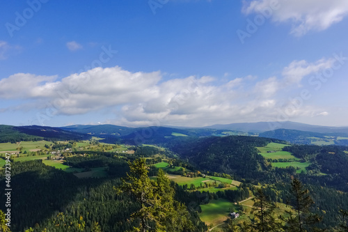 © thomaseder, Fototapeta premium green landscape with fields forest and mountains with white clouds on the blue sky