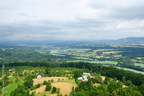 © grondetphoto, Obraz premium Green landscape with trees, houses and distant hills