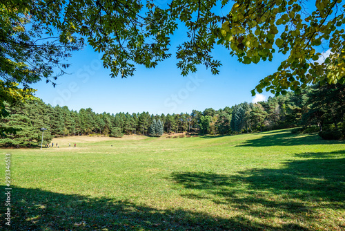 © dmitriizotov, Naklejka premium Green lawn in the middle of the park, a warm sunny autumn day