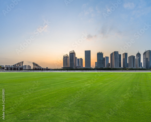Fototapeta premium green lawn with city skyline background