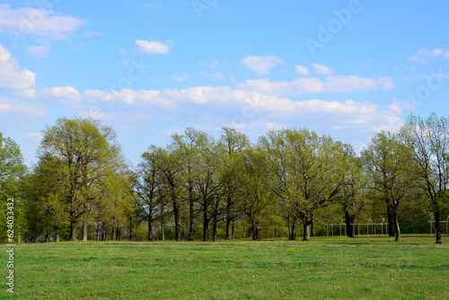 © Irina, Obraz premium green lawn with oak forest on background and blue sky and white clouds