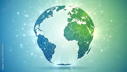 © ARONNABOSU, Fototapeta premium Green leaf Earth globe with glowing sun rays