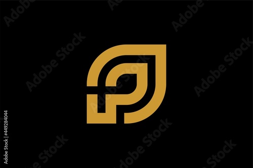 © DYNECREATIVE, Obraz premium Green leaf line logo design vector. Leaf and monogram P abstract symbol.