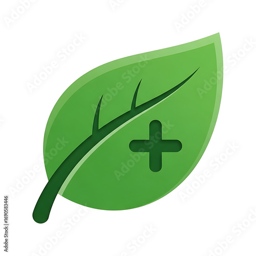 Fototapeta premium Green leaf with a plus symbol, representing health, nature, or growth.