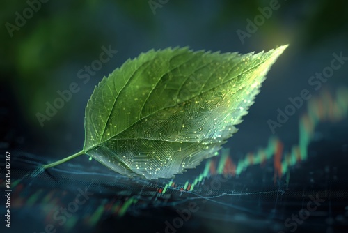 © qweqw, Obraz premium Green leaf with circuit patterns on financial chart for eco-tech startups, green finance, ESG initiatives, sustainable innovation
