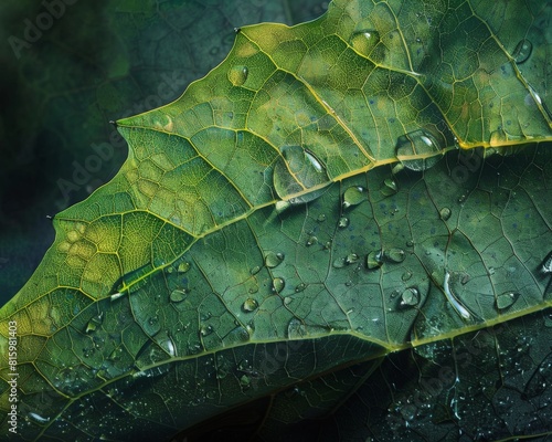 Fototapeta premium Green leaf with raindrops up close.