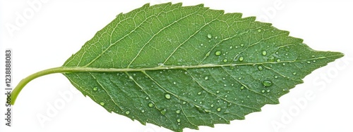 © NFTNexus, Fototapeta premium Green leaf with water droplets isolated on white background