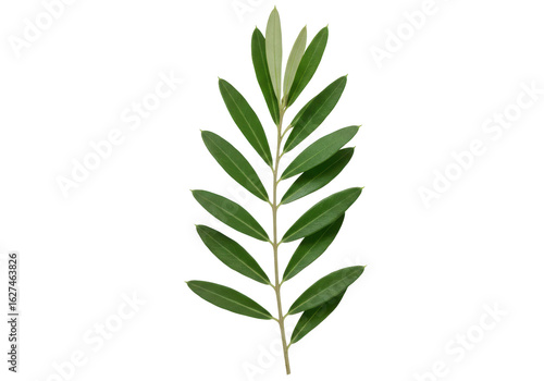 Fototapeta premium Green leafy branch with elongated leaves against a plain background, ideal for nature themes