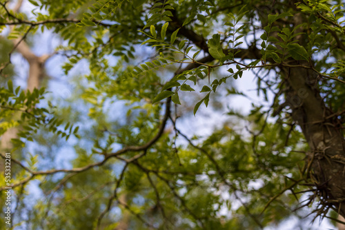 © Laura Giustozzi, Fototapeta premium Green leaves against blurry blue sky.