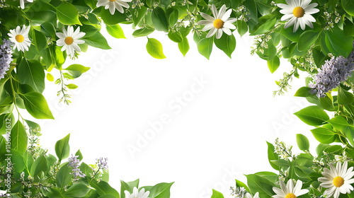 Fototapeta premium Green leaves and blooming flowers forming a frame