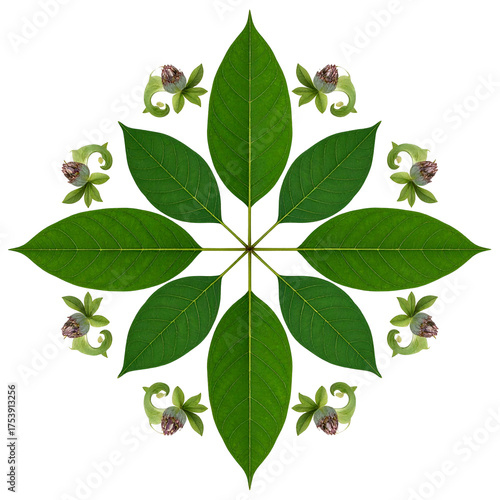 © Imperion, Fototapeta premium Green leaves and floral elements form a radial pattern on black.