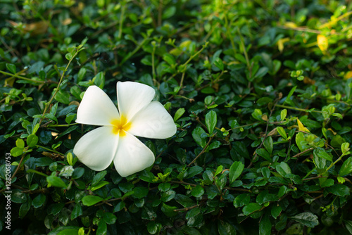 © Anna Babii, Obraz premium Green Leaves and White Tropical Flower Nature Background