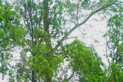 © Yuliati, Obraz premium green leaves background. tall green trees in the forest