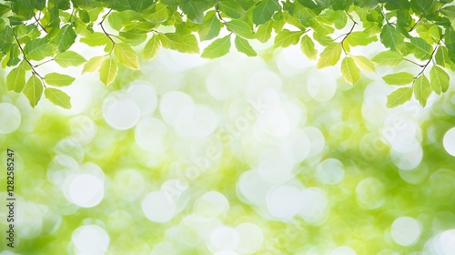 © Jarot, Fototapeta premium Green Leaves Border on Bright Bokeh Background