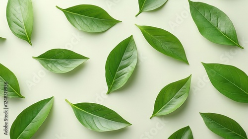 © TITISCAHYA, Naklejka premium Green leaves flatlay, pastel background, nature design