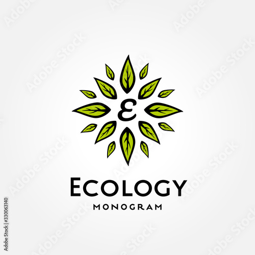 © tortugin, Obraz premium Green leaves frame monogram logo template