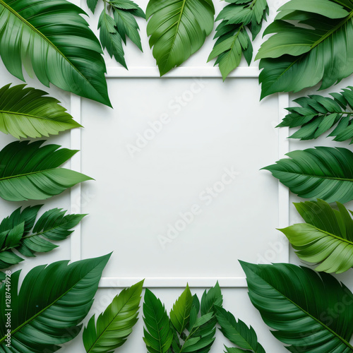 © Macholicious, Naklejka premium Green Leaves Framing White Square Natural Mockup for Product Display
