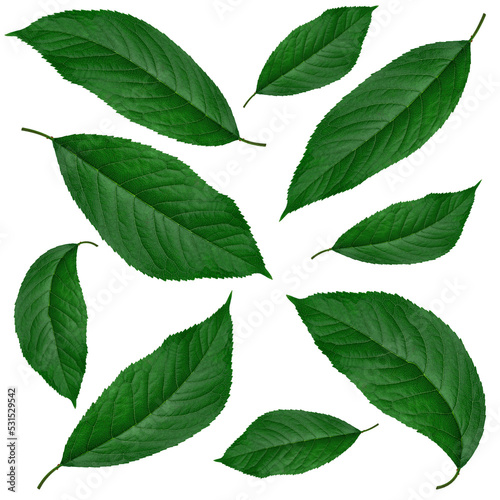 Fototapeta premium green leaves from cherry, on a white background in isolation, collage