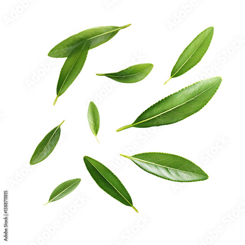 © NguyenBa, Naklejka premium Green leaves gently floating white background vibrant fresh. AI Generated