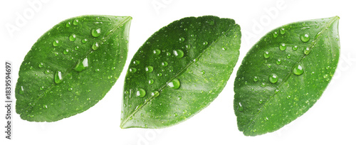 © New Africa, Naklejka premium Green leaves of citrus plant with water drops isolated on white, set