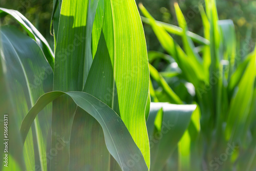 Fototapeta premium Green leaves of corn in the field illuminated by the sun.