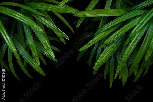 © Chansom Pantip, Naklejka premium Green leaves of lady palm or bamboo palm (Rhapis excelsa) the fan palm ornamental foliage plant on black background.