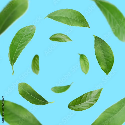 Fototapeta premium Green leaves whirling on light blue background, selective focus