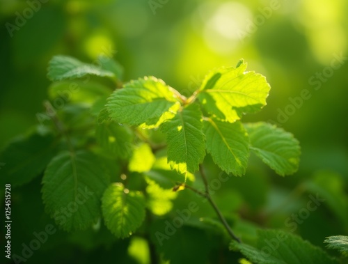Fototapeta premium Green leaves with sunlight streaming through, casting soft shadows, creating...