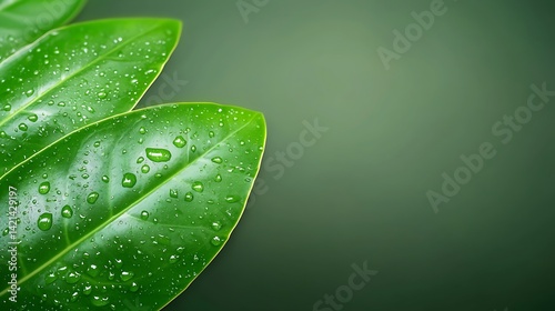 Fototapeta premium Green leaves with water droplets on a dark background create a fresh, natural...